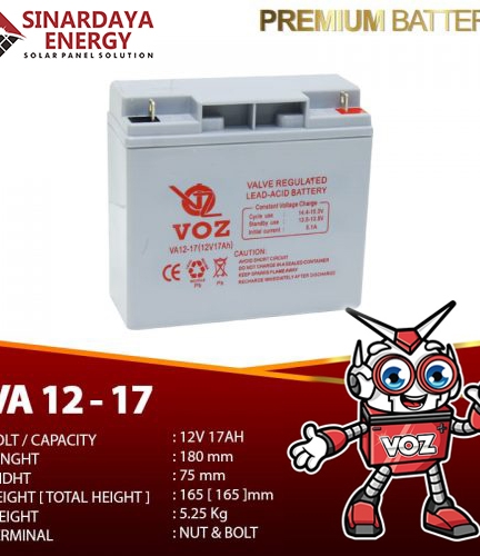 Baterai VRLA 12V 17Ah merupakan produk unggulan yang sudah menggunakan teknologi Valve Regulated, Absorbent Glass Mat. VRLA VOZ merupakan jenis baterai basah dengan beberapa keunggulan dibandingkan baterai basah lainnya, baterai VRLA VOZ 12V-17Ah tidak akan tumpah dalam penempatan apapun selain itu Aki VRLA VOZ sangat stabil dalam penyimpanan listrik kecil maupun listrik besar. Aki VRLA VOZ 12V merupakan salah satu tipe baterai yang sesuai untuk sistem panel surya yang dirancang untuk menghasilkan energi (arus listrik) yang stabil dan dalam waktu yang lama. Baterai / Aki jenis ini memiliki ketahanan terhadap siklus, atau sering disebut cycle, pengisian (charge) dan pelepasan (discharge) yang berulang-ulang juga konstan.