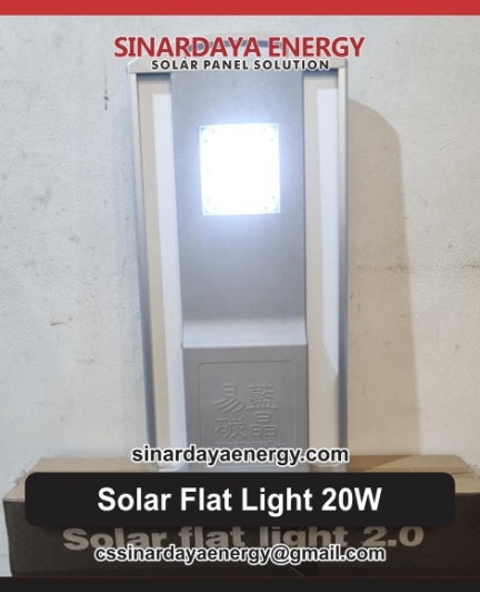 Lampu Jalan Tenaga Surya Solar Flat Light adalah Lampu jalan tenaga surya yang di buat systematis, fugsional dan efisiean. Lampu Solar Flat Light -20W ini mampu bertahan lama dengan efisiensi yang jauh lebih baik dari teknologi lampu sebelumnya. Selain hemat energi, lampu All in One Solar Flat Light ini mendukung go green karena bebas merkuri sehingga ramah lingkungan. Karena lampu PJU Solar Flat Light tidak terdapat banyak peralatan pendukung lain seperti lampu jalan tenaga surya pada umumnya atau type lama, dimana terdapat Modul solar cell, aki, box aki, kontroler, LED Lampu, kabel dll nya yang di pasang terpisah. Sementara Lampu LED penerangan jalan umum Solar Flat Light tenaga surya / integrated solar street. Semua komponen atau material pendukung system lampu PJU all in one di buat menjadi satu di dalam satu unit yang menempel pada kap lampu nya.